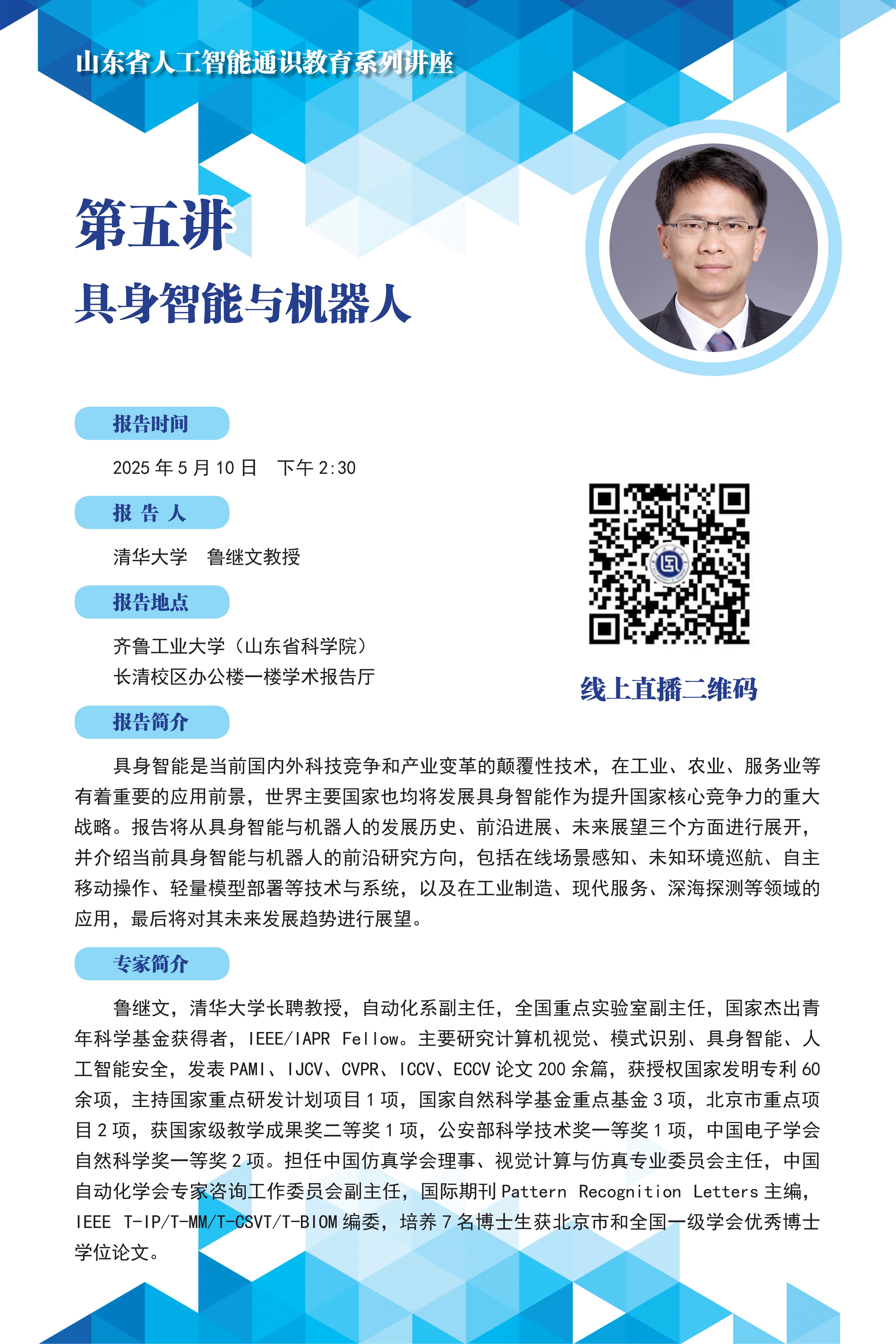 本次讲座于 2025 年 5 月 10 日(星期六)下午 2:30 开讲,采用“线下主会场+线上直播”的融合模式。我校师生可通过齐鲁工业大学(山东省科学院)官方视频号直播参与本系列讲座。